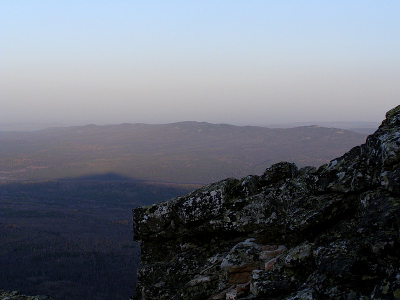 Отсюда отлично видны все окрестные хребты, в частности вся Зигальга -от начала и до конца, а также Шуйда и наш маленький Трёхгорный вдалеке, мимо которого ветер проносит дым и выхлоп Катав-Ивановского цементного завода)).