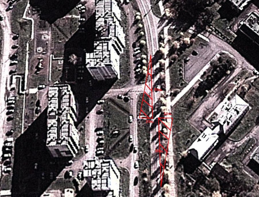 Возможно я и не права по поводу постройки треугольников, но даже по вашим построенным треугольникам видно, что эта зеленая полоса пересекается с треугольником видимости. И зачем опять же искать как вы говорите тундру, если через 100-150 метров переход около калипсо. Считаю что нерационально на таком опасном участке дороги нахождение пешеходного. Либо уж если так нужен, тогда держали бы его в наиболее удобной варианте, как для пешеходов ( которые для своей же безопасности должны выглядывать из-за кустов), так и для автомобилистов - подрезка кустов не выше 50 см.