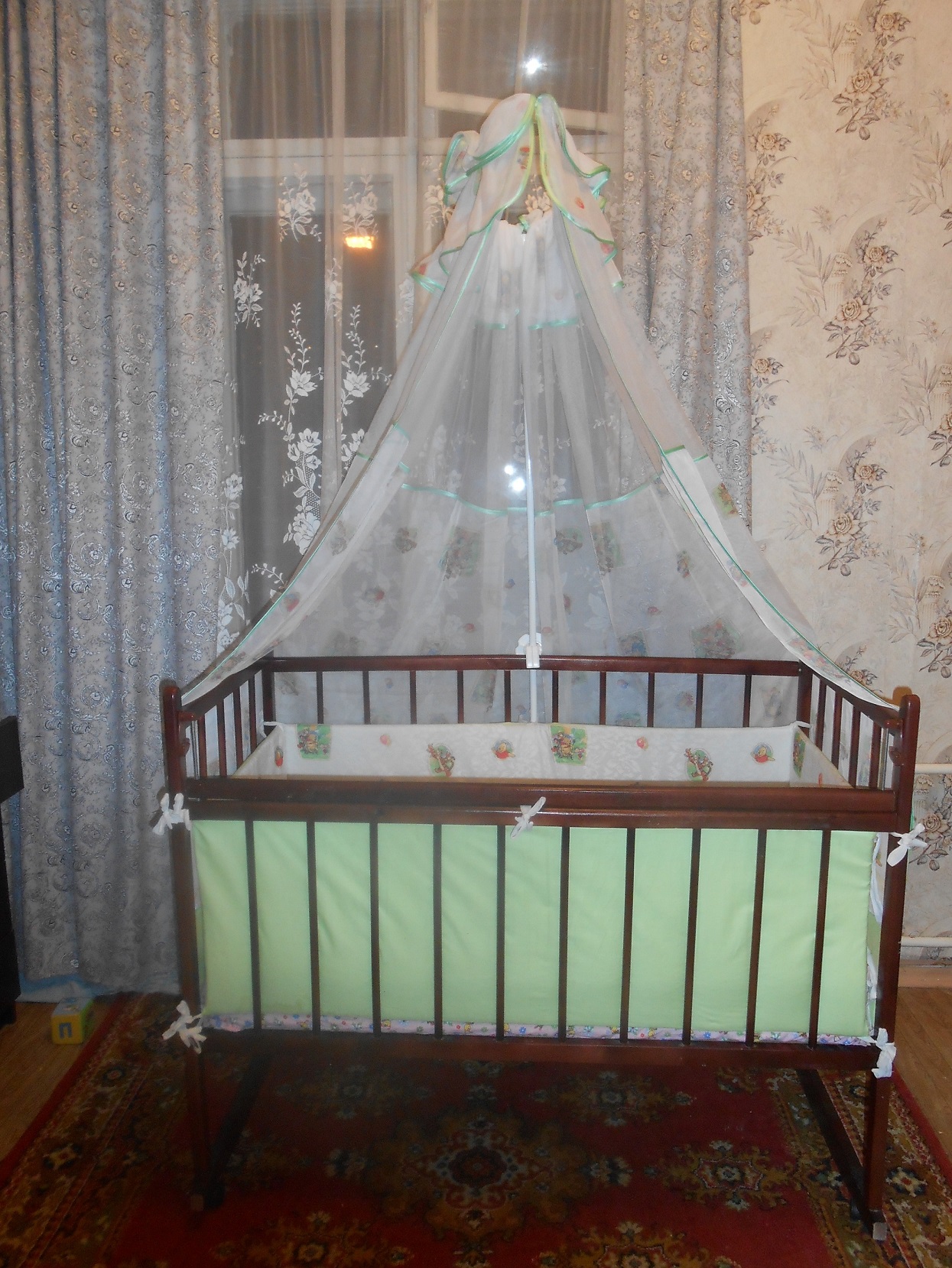 Кроватка: цвет-вишня, матрас ортопедический, двухсторонний со съемным чехлом + комплект в кроватку: цвет-зеленый, бортики высокие, простыня на резинке, подушечка и балдахин.