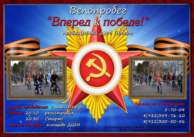 Друзья, 7 мая 2016 года состоится велопробег "Вперед к победе!", приуроченный к Дню победы в Великой отечественной войне.
