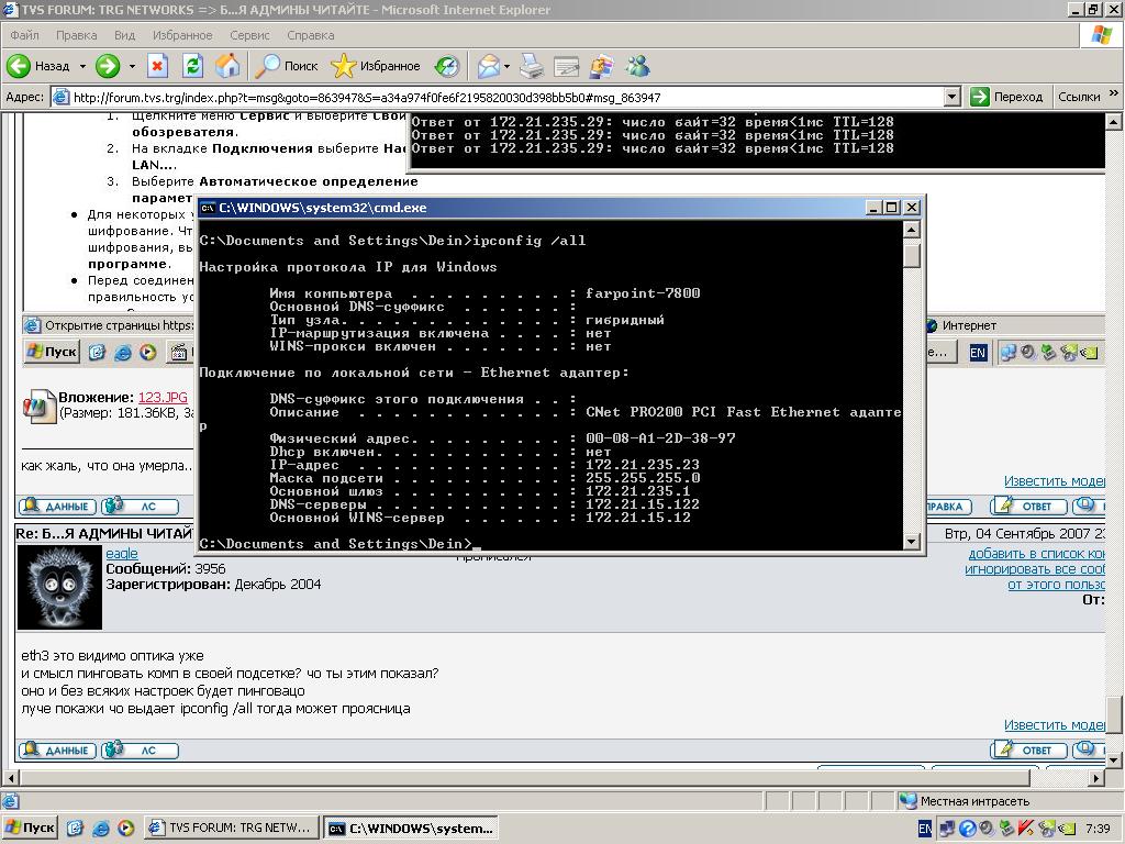 При загрузке системы сеть отсутствует, пинга до 172.21.15.122 нет. При запукске Интернет эксполера он виснет вот на этом сообщении (см. выше) и затем выдает сообщение что заданый адрес не доступен.