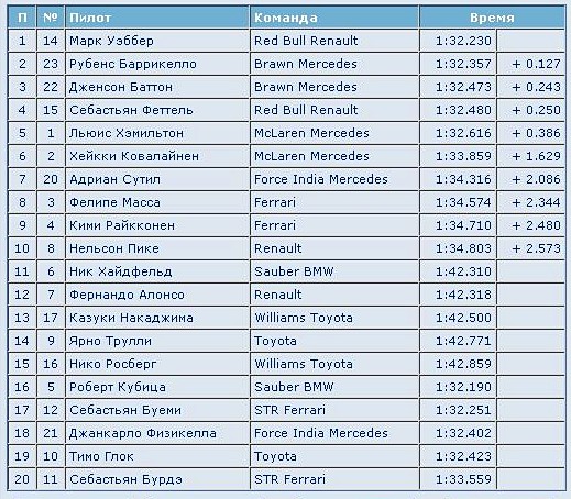 Очень интересная квалификация ГП Германии (Нюрбургринг) сегодня вышла. Впервые поул взял М. Уэббер. Феттель четвёртый, Между ними два Брауна Баррикелло и Баттона. Подтянулись два МакЛарена на 5 и 6 место.