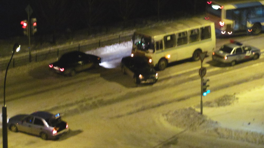 Приора проехала на красный сигнал светофора (т.к. водитель не местный, он просто не увидел светофор), столкнулась с акцентом который уже выехал на перекресток на зеленый,после чего приору развернуло и юзом выкинуло в автобус который стоял и ждал зеленого.
