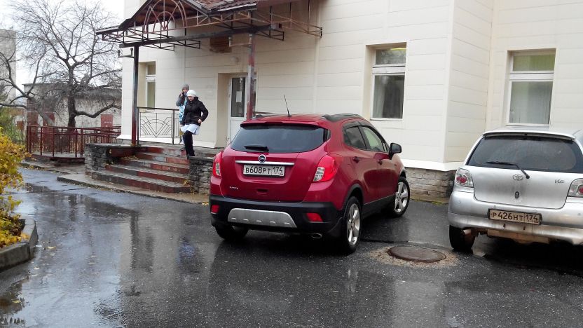 на фото просто не видно сколько места было спереди (перед опелем бы еще целый матиз влез бы), это меня, действительно, возмутило, на улице лил дождь, а мы из-за него почему-то должны под дождем таскать своих детишек, обходя его машину, мы ехали как раз за фотографом. Просто нужно немного уважения к другим
