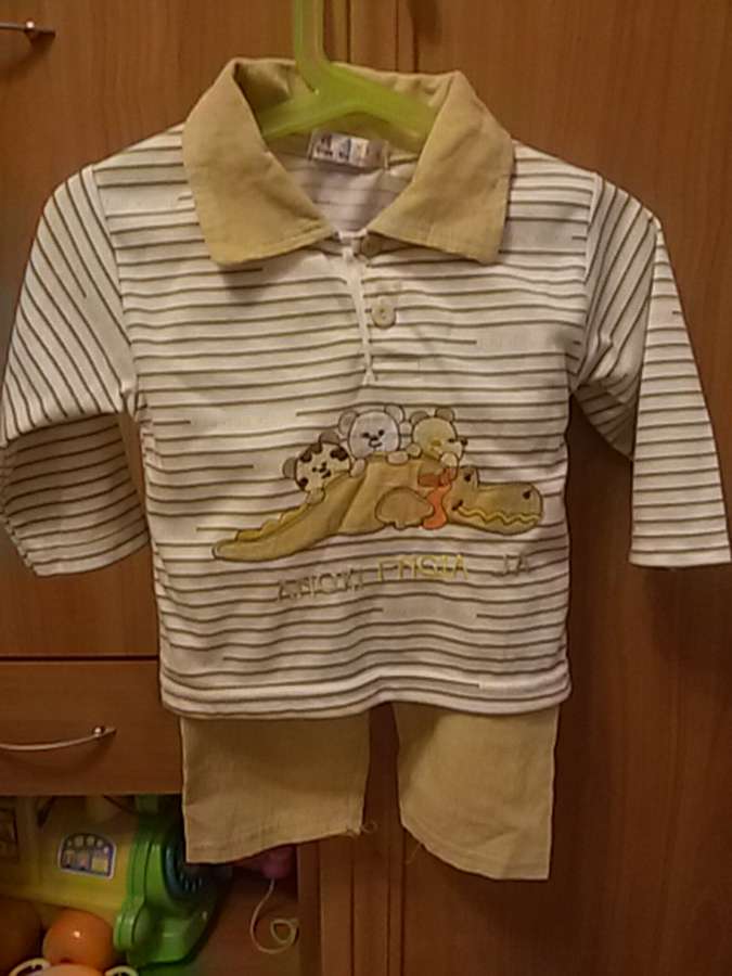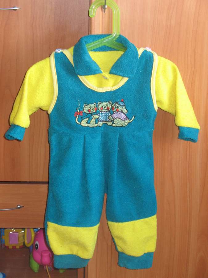 16. Костюмчик голубой с желтым: кофточка, штанишки.