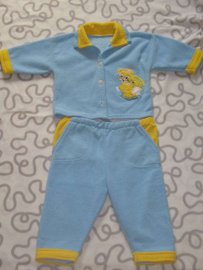 16. Костюмчик голубой с желтым: кофточка, штанишки.