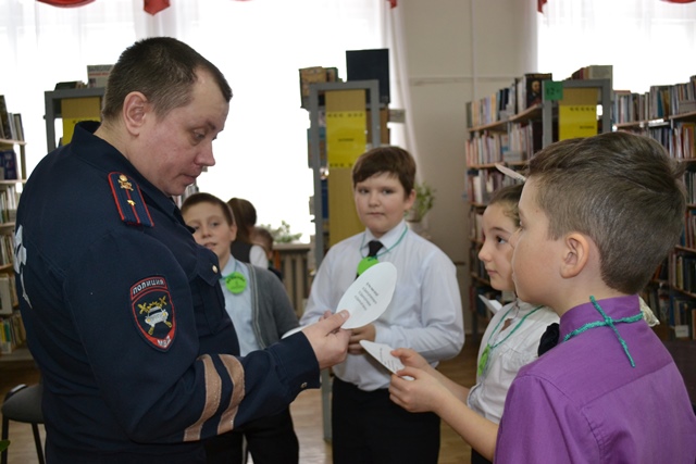 26 мая в читальном зале Центральной городской библиотеки прошли встречи школьников с представителями отдела внутренних дел и отдела ГО и ЧС: инспектором по пропаганде безопасности дорожного движения, младшим лейтенантом С.В. Третьяковым и начальником отдела по безопасности, ГО и ЧС администрации города В.Н. Егоровым.