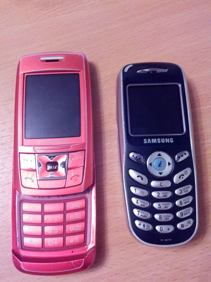 Samsung-E250, Samsung-X100. Дисплеи целые. У красного оторван шлейф, нет крышки. АКБ возможен.
